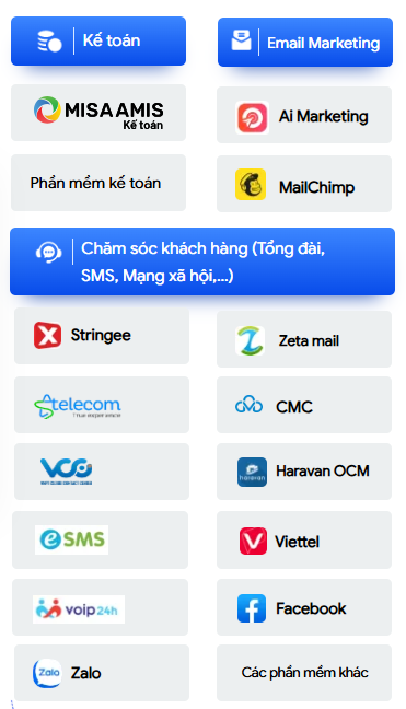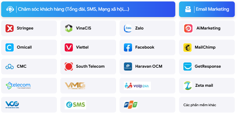 - Kết nối Email Marketing, ZNS, SM, tổng đài chăm sóc khách hàng