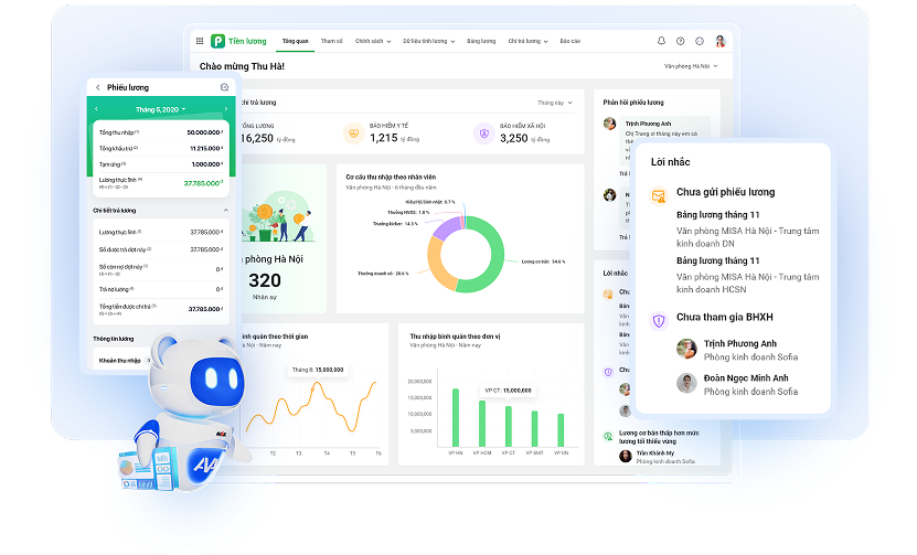 - Đồng bộ chấm công - tính lương: Tính lương ca kíp, doanh số, KPI, tự động tính thuế, lương thưởng
