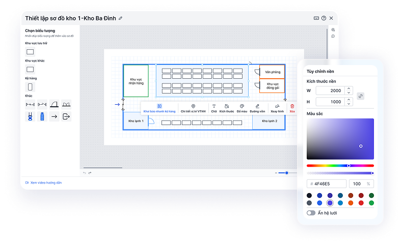 - Giao diện trực quan theo sơ đồ kho thực tế dễ dàng kiểm soát vị trí lưu trữ